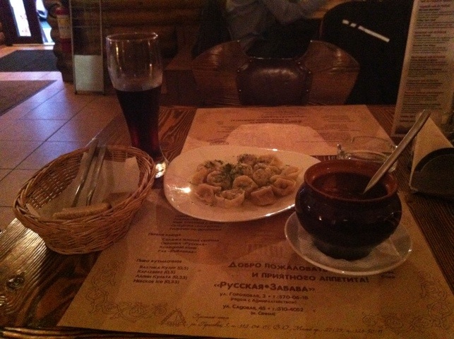 Tripling down on the Russian options at Pelmeny restaurant on Voznesensky Prospekt. From left to right: Kvass (very tasty), Siberian Pelemeni in butter (even tastier) and borsch (spicy and warming). I may not have the hang of the language yet, but I could survive eating like a Russian quite comfortably…