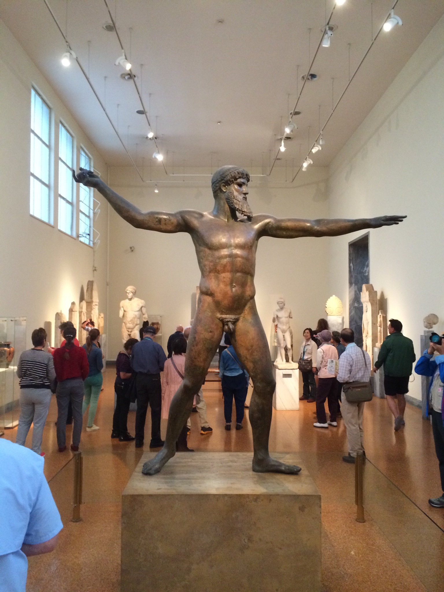 Sublime history of another kind was the order of the day the next morning, as I made my way to the National Museum of Archaeology. With such a resource as the history of Greece to draw on, this could hardly fail to be spectacular, and as much as I may have seen more statues in the past two days than in the course of my life to date, I haven’t tired of them yet. The museum contains the Death Mask of Agamemnon (so called by Schliemann), several rare and exquisite bronze statues (far fewer of these survive from ancient times than their marble equivalents), and items both unspeakably ancient and of such quality of manufacture and art that you can’t help but linger over them.