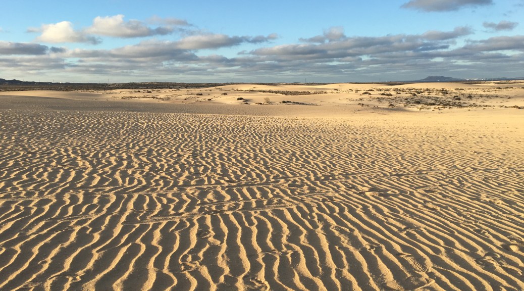 Fuerteventura is a long, mostly flat island that’s essentially one long scrap of volcanic rock running north-south not too far west of the African coast. It’s one of the oldest islands in the Canary archipelago, formed (like the Hawaiian Islands) by a hot spot deep within the earth’s mantle that still keeps the more westerly and younger islands actively volcanic. Fuerteventura though is long extinct and eroded, its calderas now manageable peaks and its beaches shallow sweeps along the coast. It’s popularity as a tourist destination is obvious, though it’s overshadowed somewhat by the neighbouring islands, such as Lanzarote and Gran Canaria. A lot of the landscape is a barren moonscape of volcanic rock, where goats and chipmunks can get along quite well but more picky creatures like humans have to work at it. There’s a bit of variation here and there, such as the dunes of the northeast and far south and the rocky hills of the Midwest, but as a whole the scenery doesn’t vary a lot.