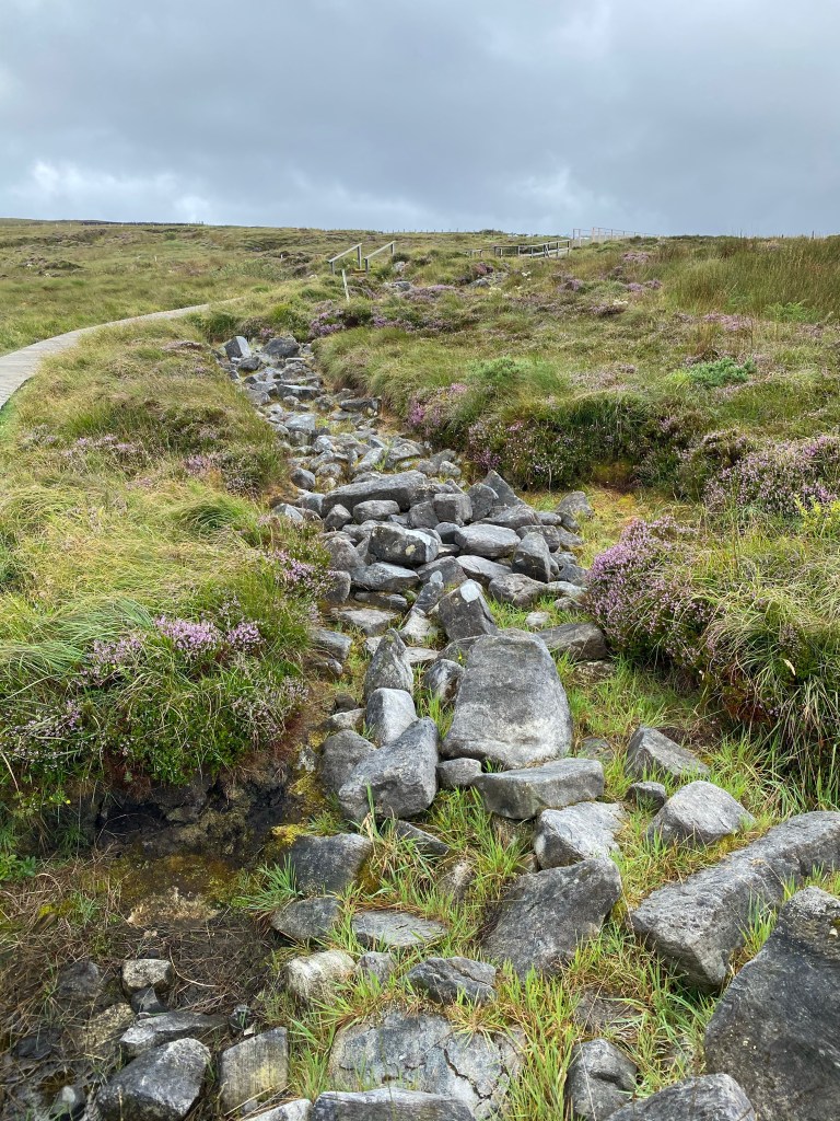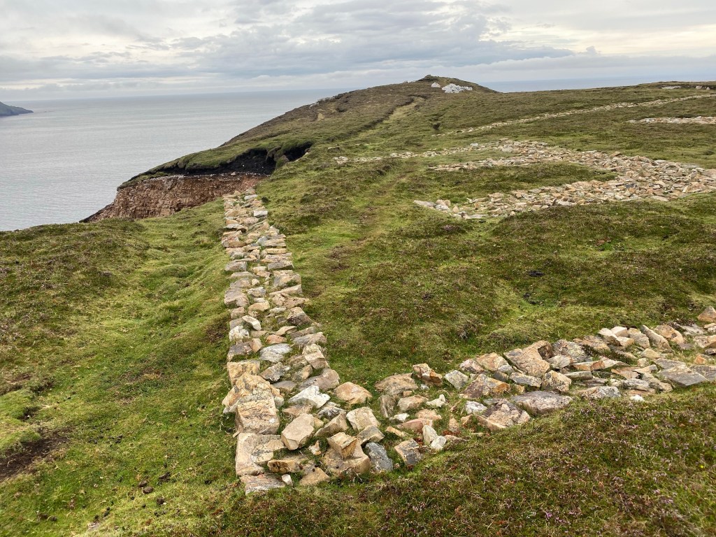 Further east, we found our way to the Céide Fields. Buried for millennia under peat bogs, near the strikingly striated Céide Cliffs, these unprepossessing stone walls are in fact as old as the pyramids and form Ireland’s most extensive Neolithic site and the world’s oldest field system. Covid had closed the nearby interpretive centre, so it was hard to get a feel for the extent of the site (only part of which has been excavated) but its story of deforestation, climate change, and population collapse struck close to home.