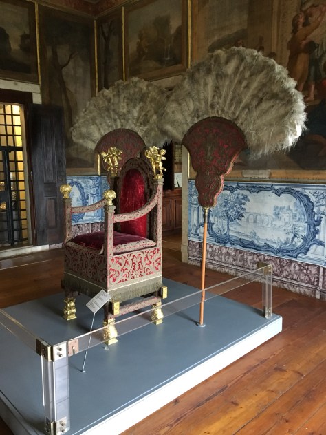 Once I left the Castelo and the peacocks behind, I made my way downhill in a more or less random fashion, coming across the remains of a roman-era amphitheatre along the way (a hazard of the trade when you travel in most of Europe) and, a little further downhill, the Romanesque Patriarchal Cathedral of St. Mary Major. As solid a lump of stone as you’d expect to find in a city prone to the odd earthquake, it’s a pleasant contrast to the more ornate confections to be found in Italy and Germany, with some interesting sarcophagi tucked away in odd corners. You can pay extra to visit the treasury, which I did, which has two highlights in the form of a view of the cathedral from the gallery above and a spectacularly ornate gold and jewel-encrusted monstrance. Sadly, no pictures of the latter, due to the attendant’s care, but I did snap one of the nearby throne, with its ostrich-feather fans.