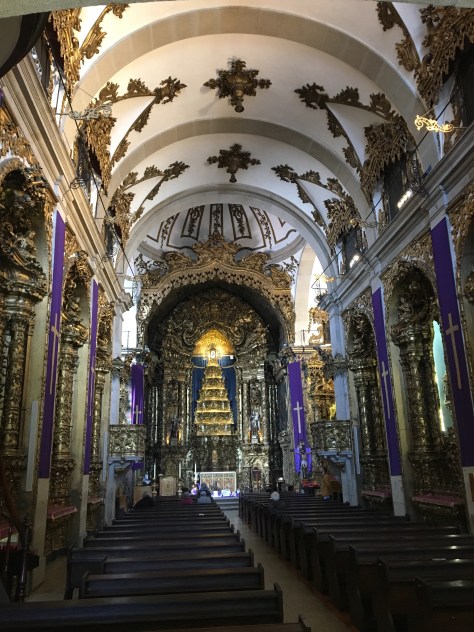 Next door was lunch. Or at least a snack that stood in for lunch – the Amarino ice cream store, where I enjoyed a roseate ice cream cone that took some care and attention to avoid dripping all over me before I could eat it. While perhaps not the healthiest option for lunch, this was a holiday after all, so I felt some justification. After that, I wandered for a while, first to the twin churches of Igreja do Carmo and Igreja das Carmelitas, which are ornate enough on the outside and utterly baroque on the inside, with gilded wood carving everywhere except where there are over-the-top depictions of saints and the Passion. If the churches in Northern Ireland were this full-on, growing up as a Catholic would perhaps have been a lot more entertaining.